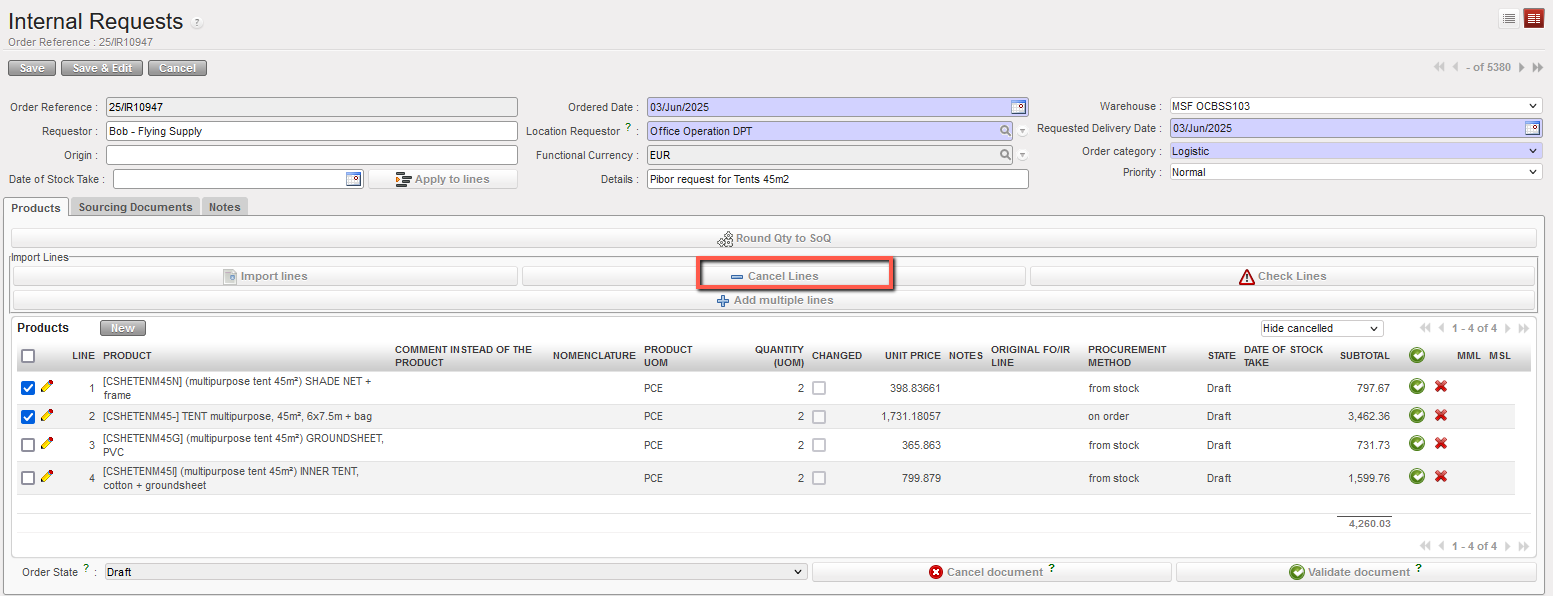 Only “Draft” or “Validated” lines can be “cancelled”. If you wish to cancel several lines at once, you may select them via the check boxes available on the left of the lines and click on the button “Cancel Lines” at the top of the Products table.