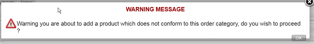 6. Select an order category available from the drop-down list next to the “Order category” field. Encoding the proper category will help you to better classify your Internal Requests. Note that if you try to include in an IR a product whose main type does not comply with the order category (i.e. if you try to include a LOG product on a MED IR), you will get a -non blocking- warning message.