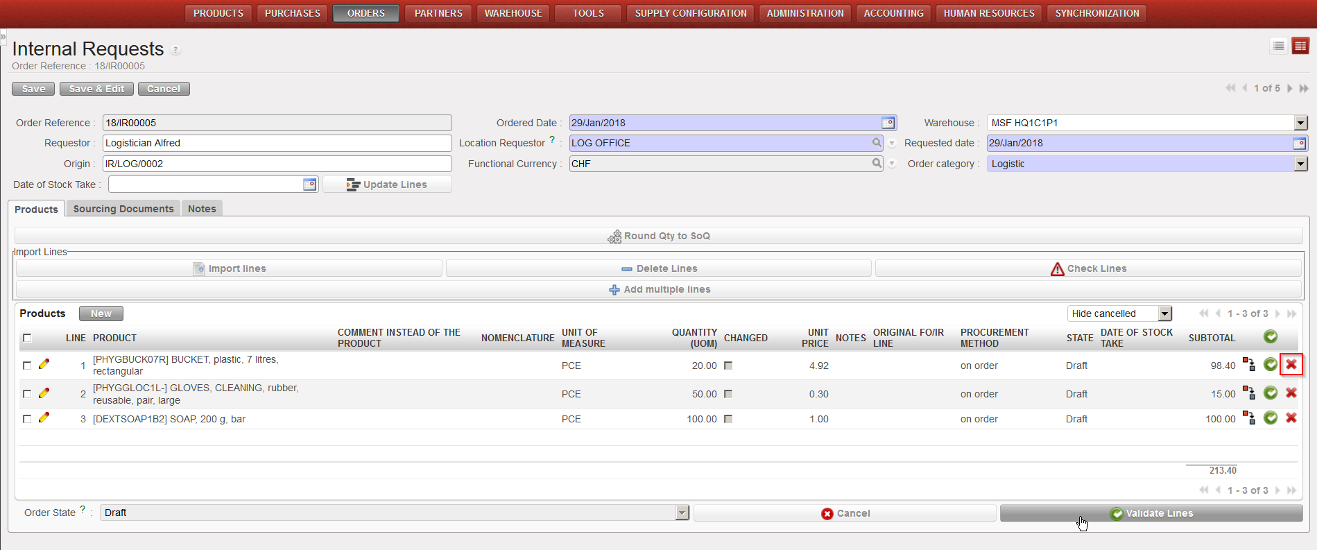 In case you made a mistake and need to delete some lines you can delete them either by clicking on the red cross at the end of the product line or by clicking on the “Delete lines” button if you want to delete several lines in one click .