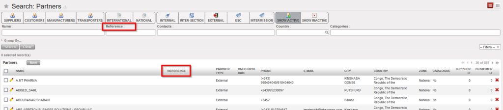 The Supplier and Customer main screens contain filters to refine your search and grouping options. The lower part of the search screen shows existing partners and displays information such as name, reference, partner type, phone number, e-mail address, city, country, …