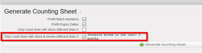 Its possible to specify system should add products with movements in the last X months. and the same number of months specified to add products can be used to filter and display also the batches of the added products based on this timed selection. Where user has added products specifying products with movements in the last 5 months, this would be the default option ticked in the 4th checkbox on the “Generate Counting sheet” pop-up and only batches which have been moved in the last 5 months will be displayed in the counting sheet.