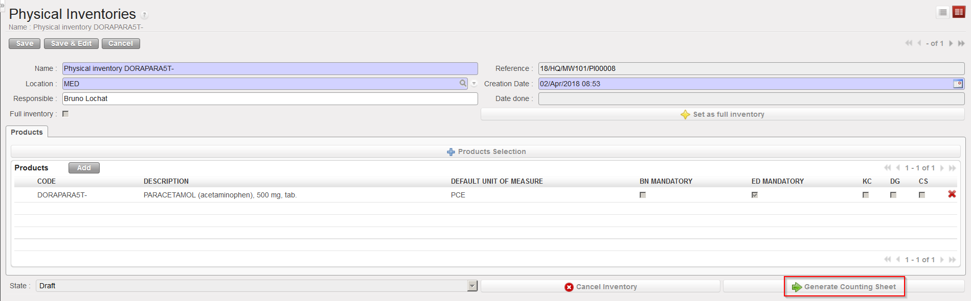 8. The PI switches to the state “Counting“. This means that the counting is currently ongoing in the warehouse. The tab “Products” (which was already present before) shows the products which have been selected. A second tab named “Counting sheet” has now appeared. According to the selection done at the previous step, this tab shows which products/batches should now be counted in the location.