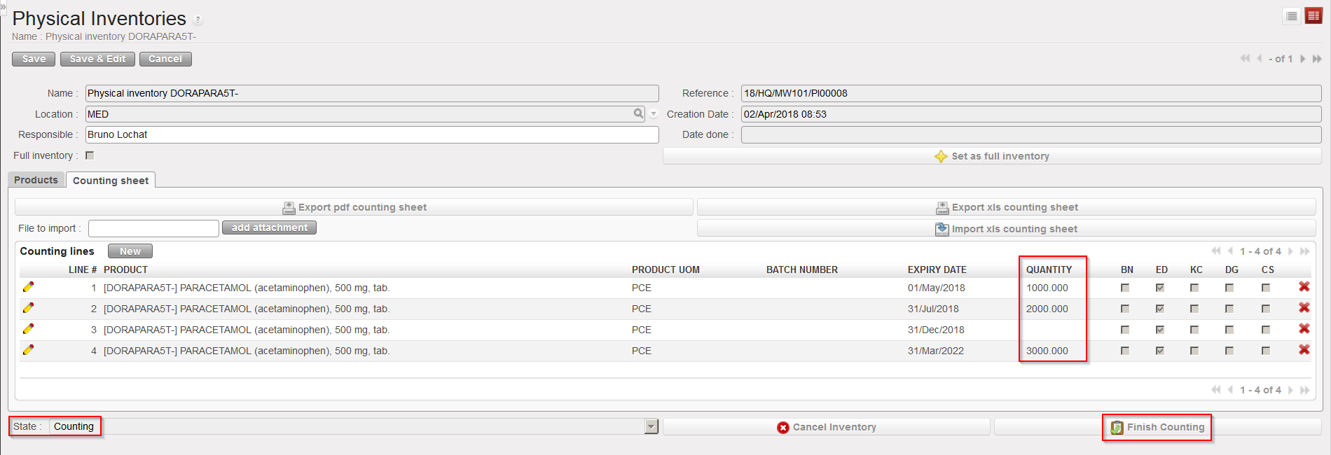 11. The state of the PI is still on “Counting” but you may now see on the “Counting sheet” tab for each counted product/batch, the quantity which has been counted in the warehouse. Click on “FinishCounting“.