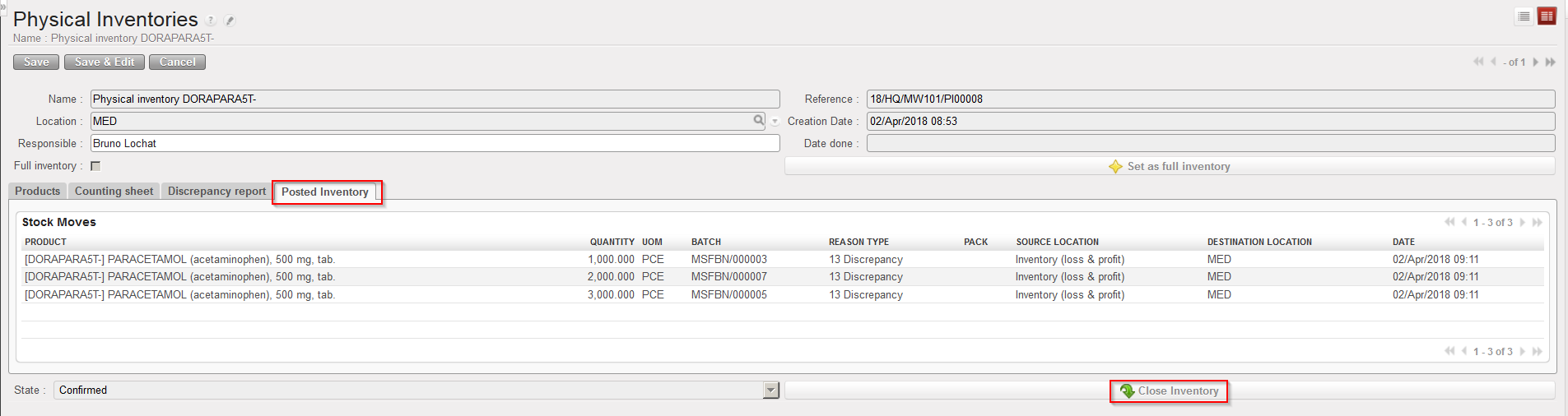 16. The PI switches to the state “Confirmed“. An additional tab called “Posted Inventory” appears, listing all movements which have been created by the PI. Click on “Close Inventory“.