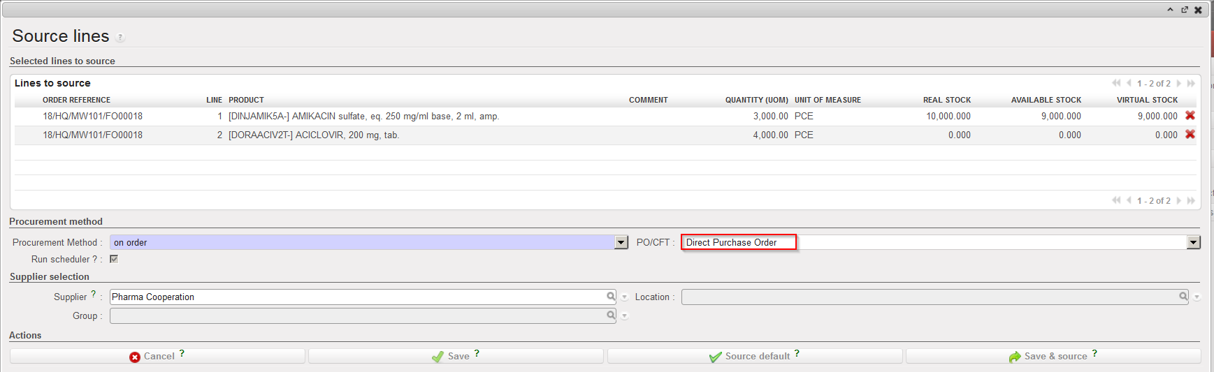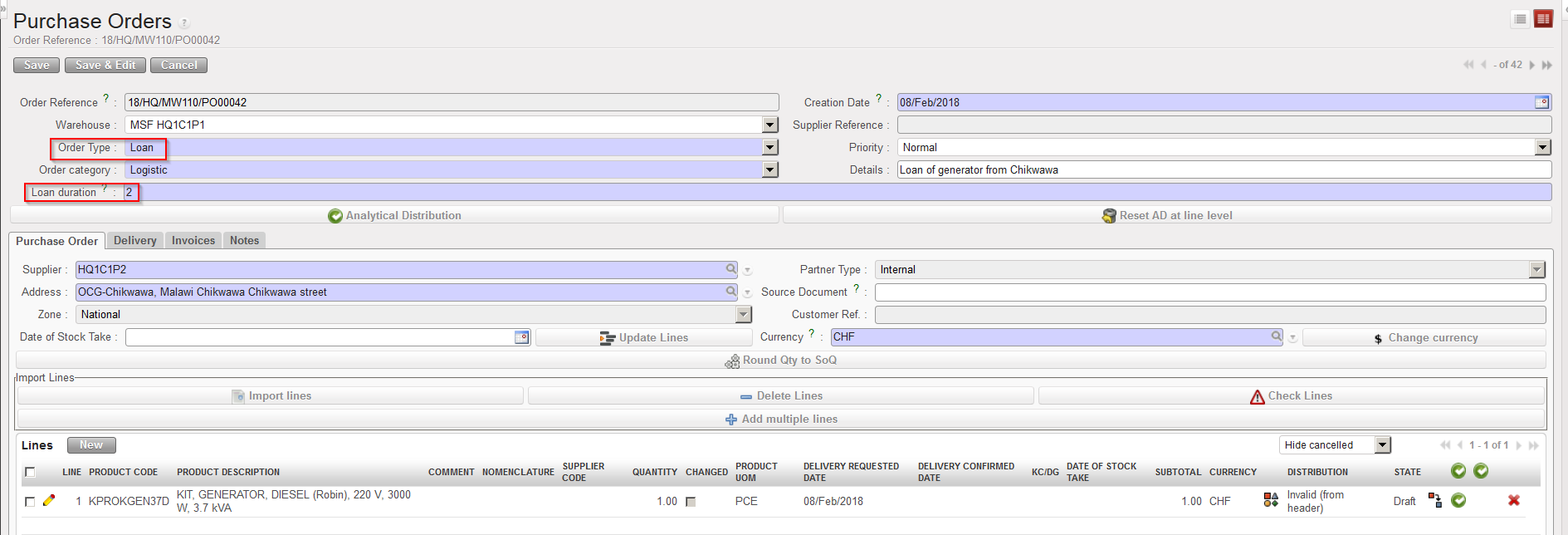 As “Supplier“, select the instance which will be lending you the goods (or an external partner if goods are borrowed from outside MSF).