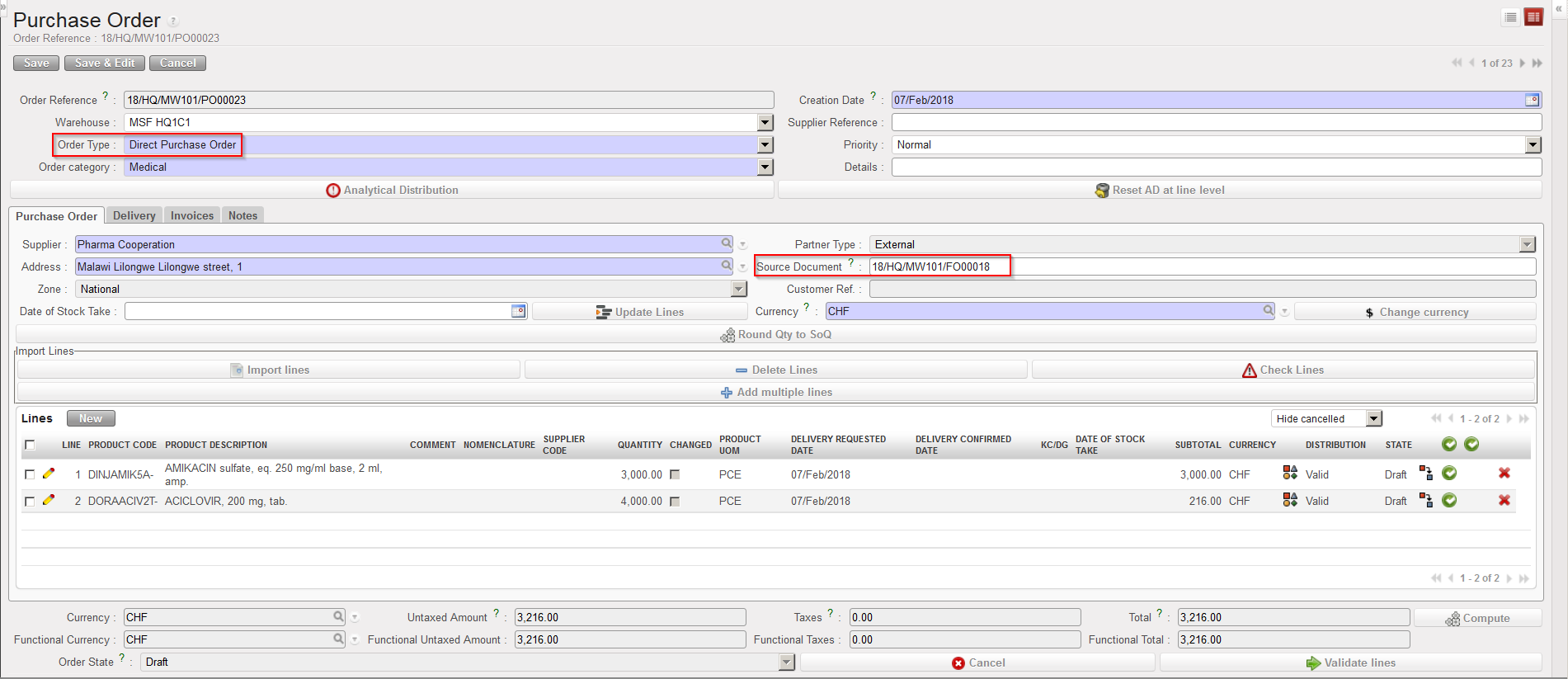 A Direct Purchase Order is a PO for which the goods should not be delivered not to the instance where the DPO was created (usually coordination), but directly to the instance (usually project) which needs the goods (usually requested to coordination via a regular PO). A DPO cannot be created from scratch but must be created by OST. Suppliers allowed on DPO are external suppliers or ESC (but not internal partners). Note that the sender of the DPO and the receiver of the goods should be in the same mission.