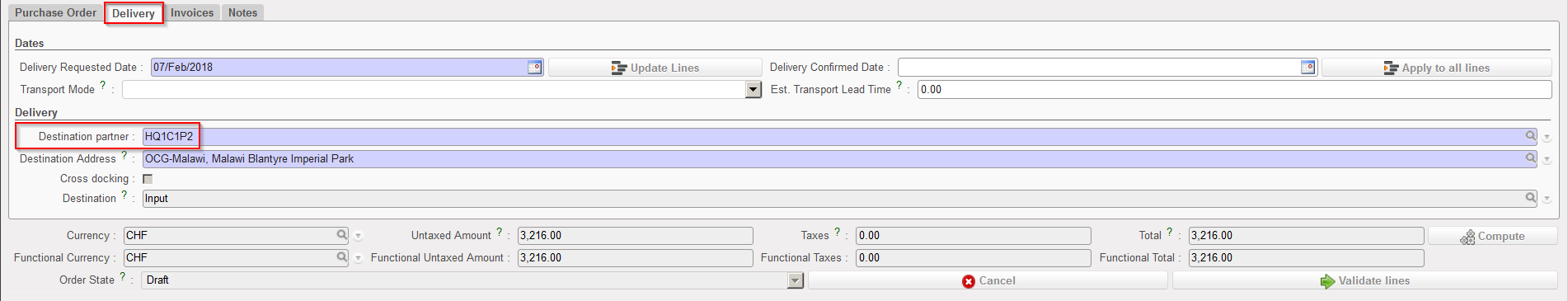 7. Click on the “Delivery” tab and check the details of the “Destinationpartner” (i.e. instance -usually project- where goods should be delivered directly).