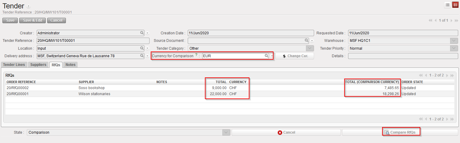 Note that “Currency for Comparison” field enables to select a currency from local currency, functional currency or a second local currency. This currency will be displayed in the “Comparison” popup once you click on “Compare RfQs” so that user can compare in his preferred comparison currency.