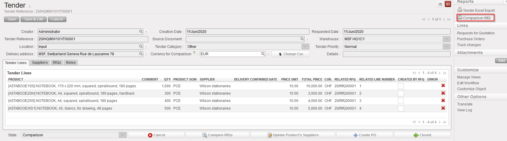 To compare the different RFQ responses, go to:Purchases / Purchase Management / Tenders