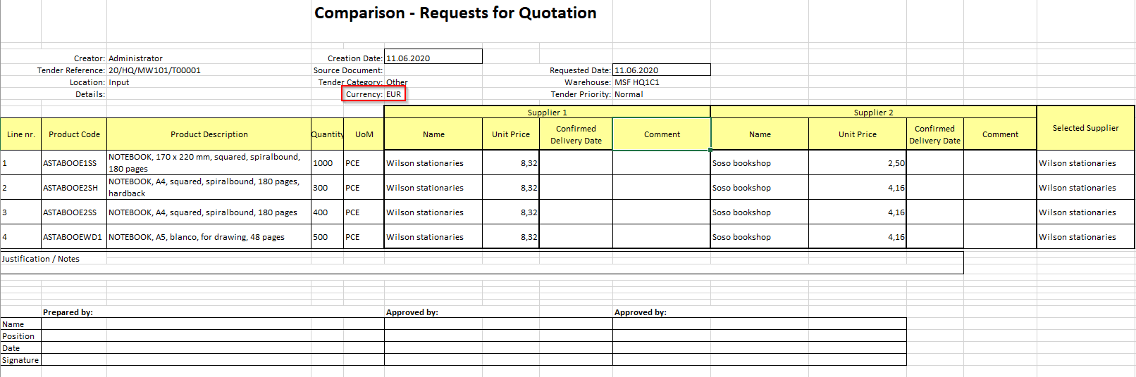 Once all Requests for Quotation have been updated with the relevant supplier quotation information and are in the state “Updated“, the user will be able to compare the different suppliers’ offers and select the appropriate supplier for each requirement (in the Tender lines).