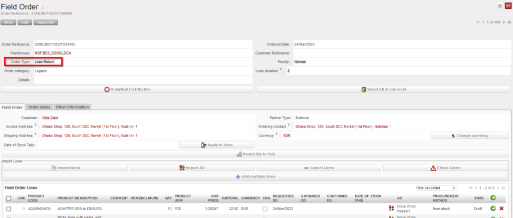 For internal loans, like other POs, when validated and synchronised, this PO will create an FO on the supplying (lending) instance. Additionality, to act as a reminder to the both sides, the system will also create a loan PO on the side of the lender when the FO will be sourced (usually to stock), to express their need to have the products returned by the agreed date. The corresponding FO will be created on the borrower’s side when lender validates and synchronizes the PO.