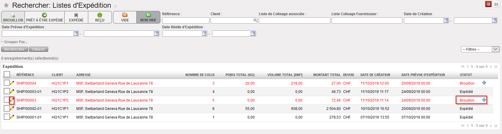 - Repérez le main SHIP que vous souhaitez expédier vers un projet/client. Il devrait être au statut “Brouillon”.