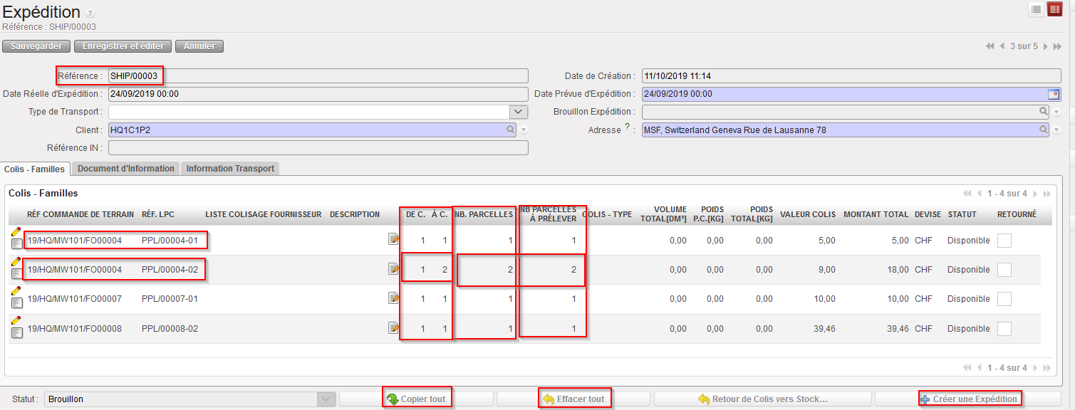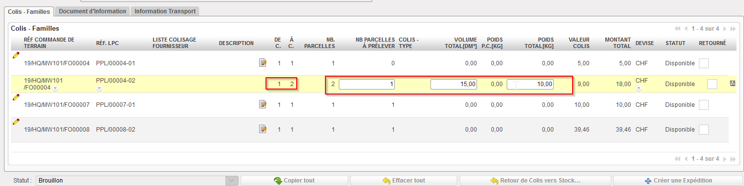 Tous les colis de ce Client de l’Expédition principale Brouillon sont listés et peuvent être sélectionnés.
