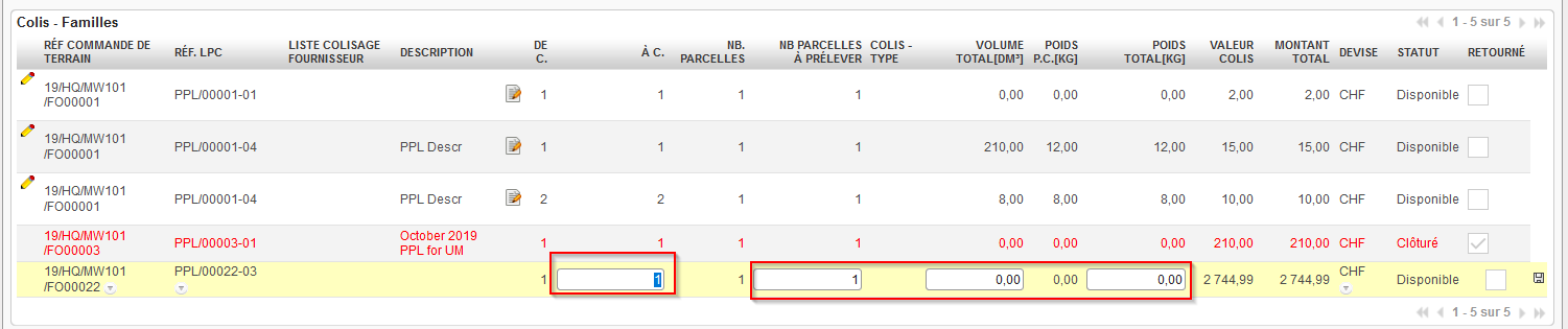 4. Le “Volume Total[DM3]” et le “Poids Total [KG]” sont repris de la PPL traités en amont. Ces champs peuvent être édités seulement si l’information n’a pas été mise à jour dans la PPL (rappeler vous que ces champs ne sont pas obligatoires au niveau de la PPL) – dans l’exemple ci-dessus, toutes les lignes peuvent être updatés puisque le poids et le volume sont à « 0 ». L’Edition peut être faite en utilisant l’icône crayon