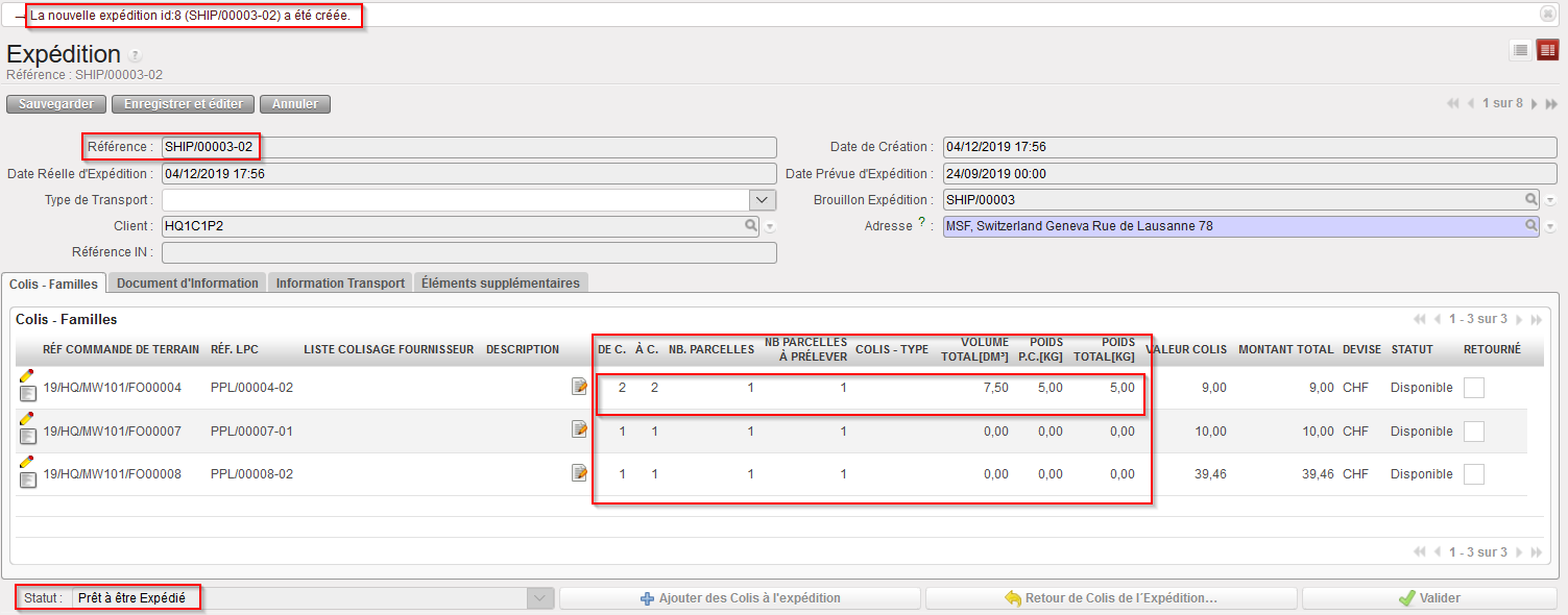 Une référence (SHIP/000XY-AB) est donnée au sous-SHIP créé par le système. Celui-ci inclut tous les colis sélectionnés sur le Main SHIP (SHIP/000XY). Le sous-SHIP est au statut “Prêt à être Expédié”.