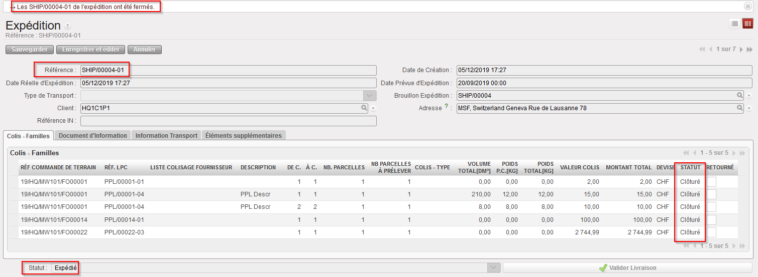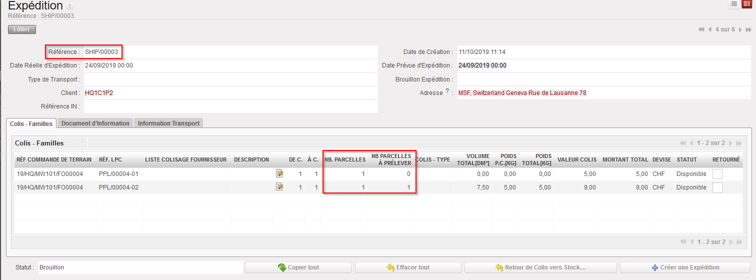 Etant donné que tous les colis ont été sélectionnés sur le main SHIP, celui-là est maintenant vide. Notez que le main SHIP conserve le statut “Brouillon” pour permettre le retour de produits et accueillir d’autres colis pouvant arriver depuis d’autres PPLs qui seraient validées pour le même client.