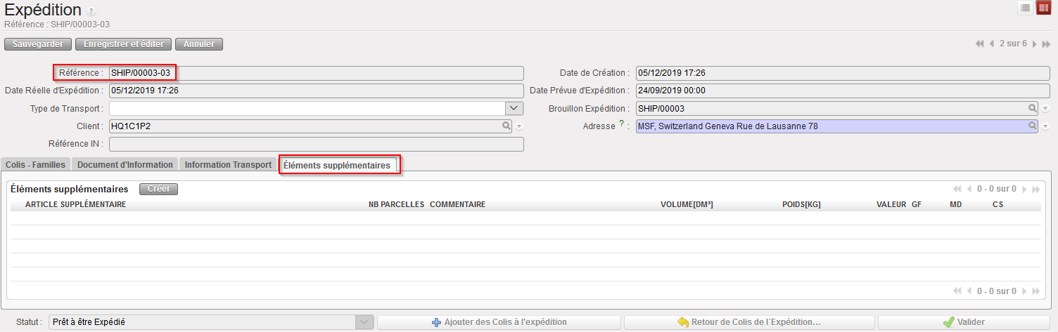 Notez que l’onglet “Eléments supplémentaires” peut être utilisé pour indiquer les produits qui auraient du être ajoutés à l’Expédition mais qui ne faisaient pas partis des documents précédemment traités (PPLs, PICKs, FOs). Cet onglet n’est éditable qu’au Statut “Prêt à être expédié”.