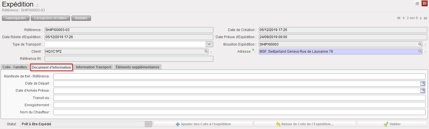 | Onglet “Document d’Information” sur une Expédition |