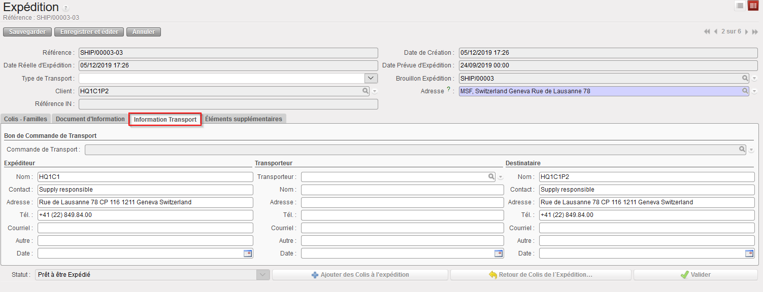 | Onglet “Information Transport” sur une Expédition |