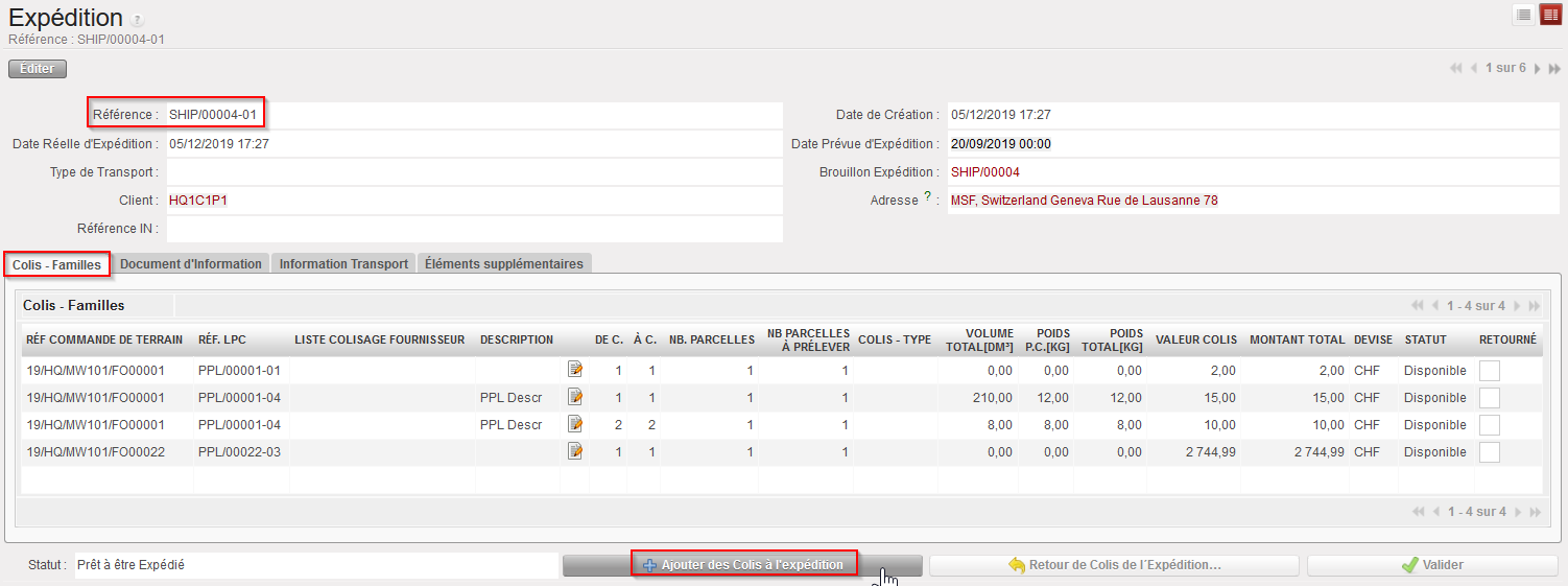 - Au niveau du sous-SHIP (onglet Colis – Familles), cliquez sur le bouton “Ajouter des colis à l’expédition”.