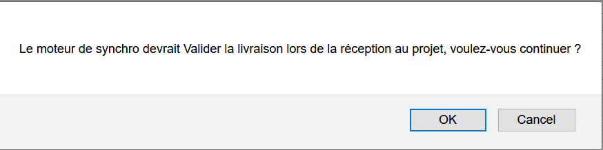 Notez que pour les expéditions envoyées vers d’autres instances UniField, la validation du sous-SHIP sera faite automatiquement par la synchronisation, lorsque la réception sera traitée sur l’instance client. Cela signifie que vous ne devez pas cliquer sur le bouton “Valider Livraison” pour ce type d’expédition. Si vous le faites, vous apercevrez le message (non bloquant) suivant.