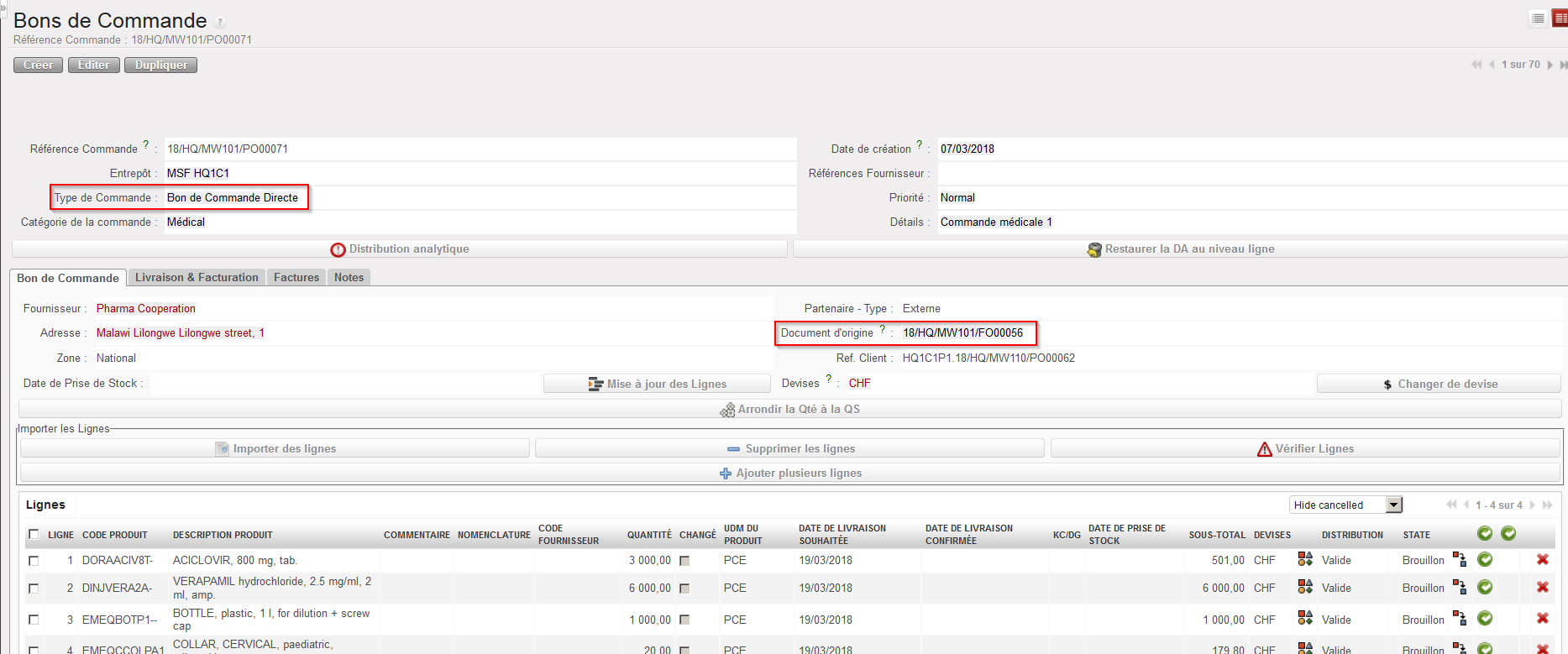 À l’instar des CFT, la plupart des RFQs sont créées automatiquement. On peut les générer en cliquant sur le bouton “Générer des Demandes de Devis” situé au bas de l’écran du CFT Vous obtiendrez autant de RFQs qu’il y a de fournisseurs dans le CFT.