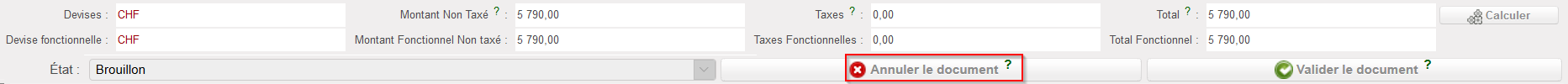 Sélectionnez la FO à annuler en cliquant sur la ligne appropriée pour l’ouvrir. La FO devrait être dans le statut “Brouillon”. Cliquez ensuite sur le bouton “Annuler le document” situé au bas de l’écran principal de la FO. Le système vous avertira que vous êtes sur le point d’annuler, confirmez si vous souhaitez annuler.