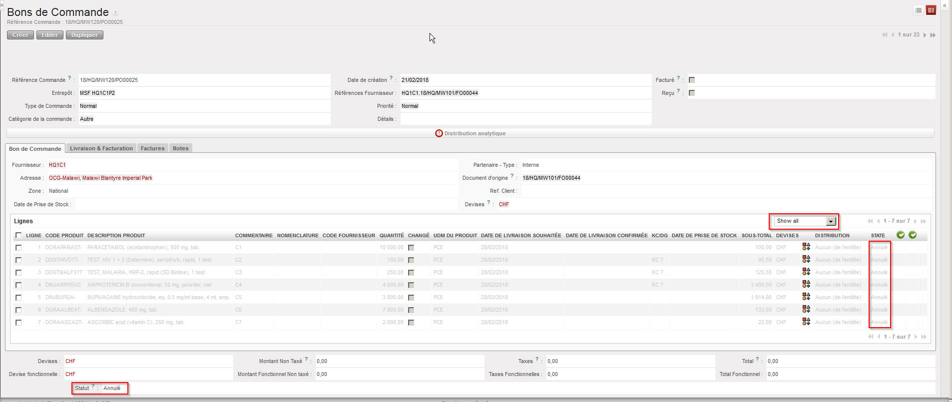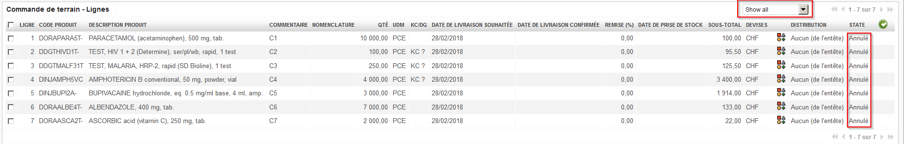 2. La FO passera au statut “Annulé” (au niveau entête). Vous constaterez que ses lignes n’apparaissent plus. C’est parce qu’elles sont aussi passées au statut “Annulé”. Vous pourrez les afficher en utilisant le filtre en liste déroulante situé en haut de la table “Commande de terrain – Lignes”. Ce filtre permet de cacher les lignes annulées (“Hide cancelled”), d’afficher toutes les lignes (“Show all”) ou de ne montrer que les lignes annulées (“Show cancelled only”)
