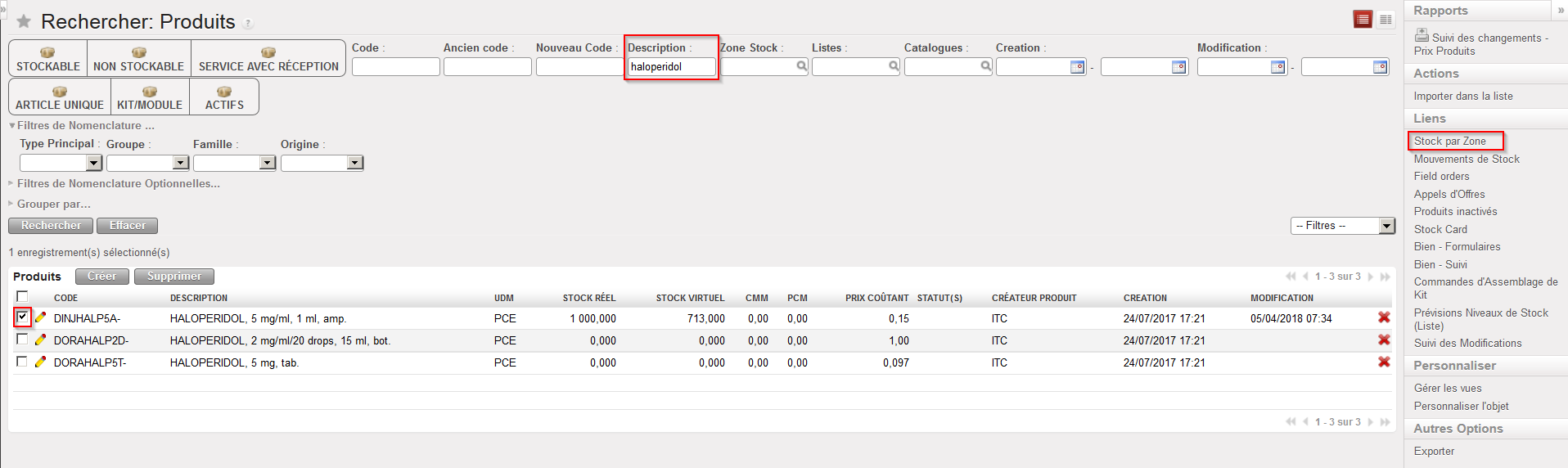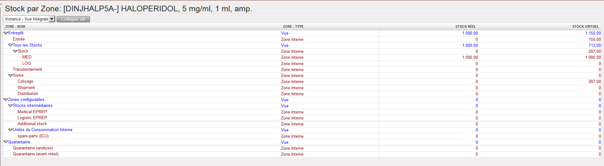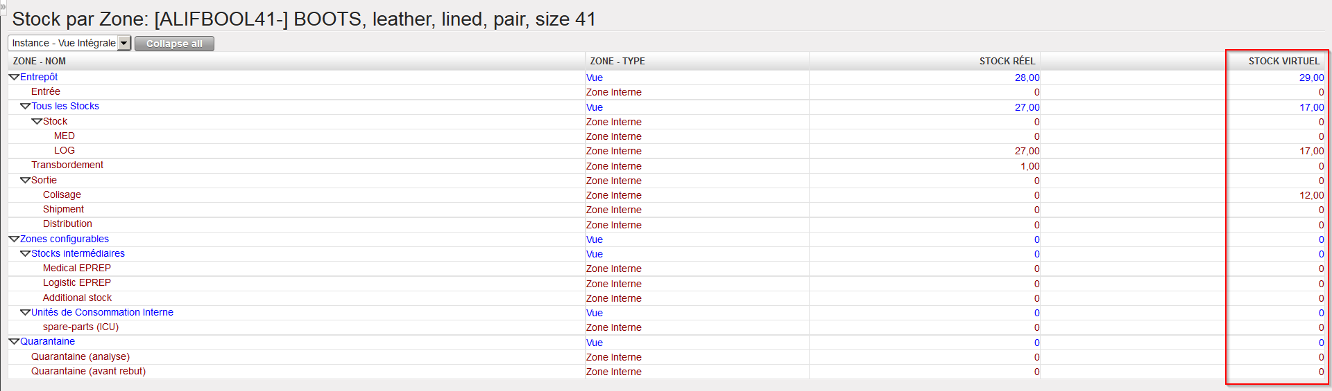 La colonne “En stock” indique le niveau actuel du stock réel dans la zone sélectionnée (ou sur l’instance si aucune zone n’a été sélectionnée).