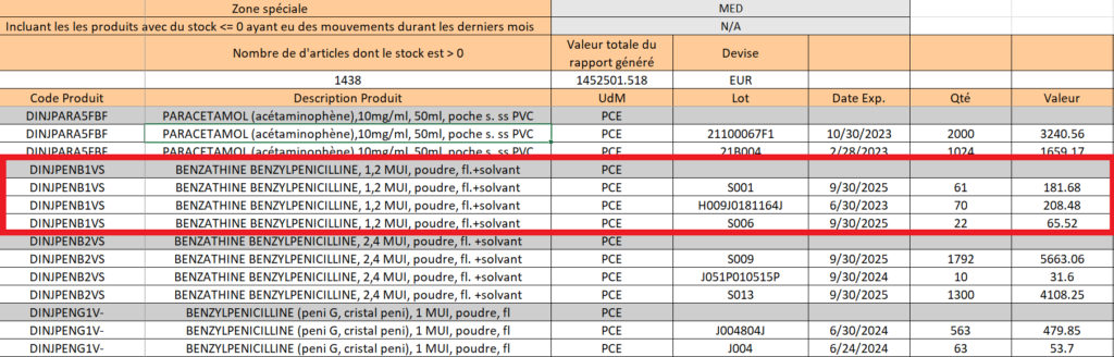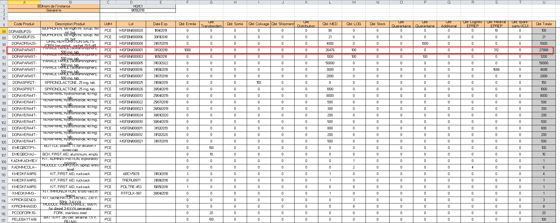 Si un produit n’est pas géré par lot, une seule ligne apparait pour ce produit et les colonnes Lot/Date Exp (numéro de lot/date de péremption) sont vides.