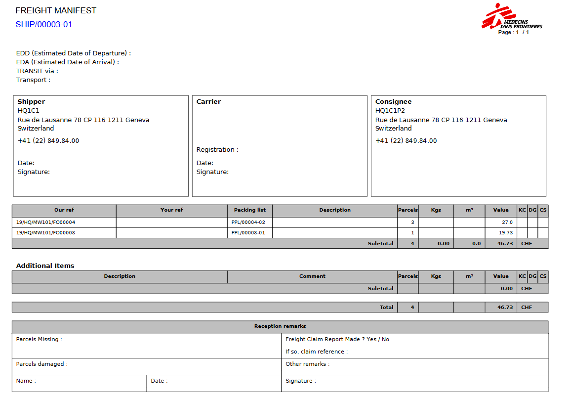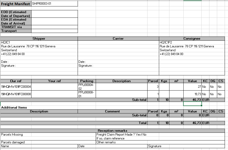 Shipper, carrier and consignee information appear on the manifest. Involved packing lists, number of parcels, weight, volume and value also appear. “Our ref” is for the FO reference at sending instance while “your ref” will be for the PO at the receiving instance.