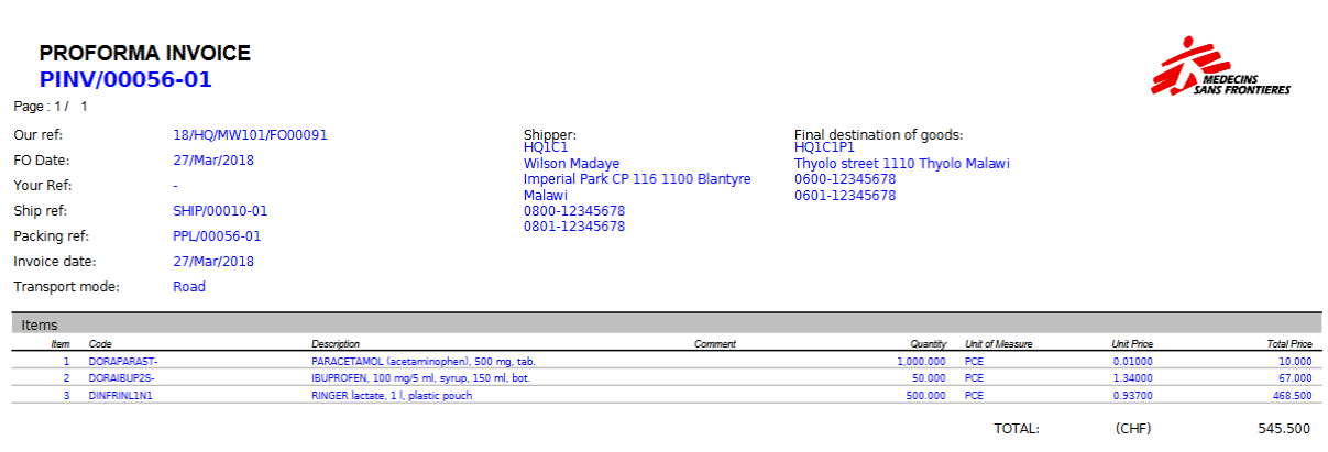 One proforma invoice is generated for each involved PPL and includes quantities and prices for each product.