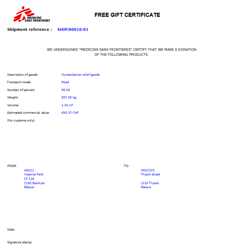 5. “Donation Certificate” option allows exporting the Certificate of Donation in PDF, it is available for all SHIPs and OUTs for all Reason Types.
