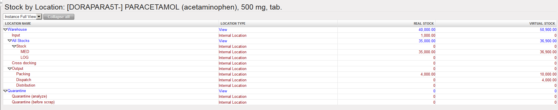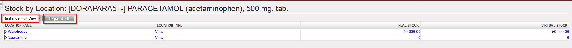 4. The “Instance Full View” is expanded. All locations belonging to this view appear and real and virtual stock levels in all these locations are showed.