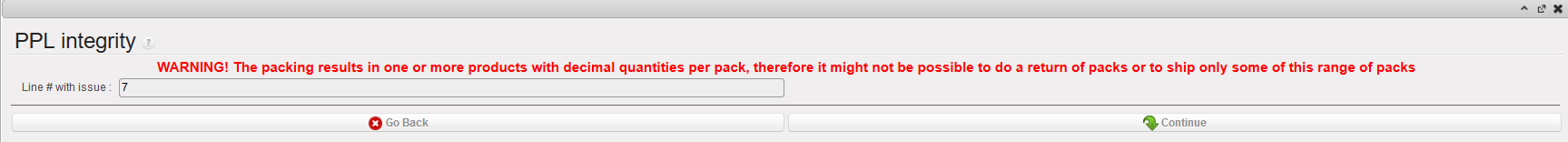 This message is a warning for later stage in case user try to “Return” partial range of boxes with decimal quantities from a PPL or from a Ship. In case of return, a blocking message will be displayed.