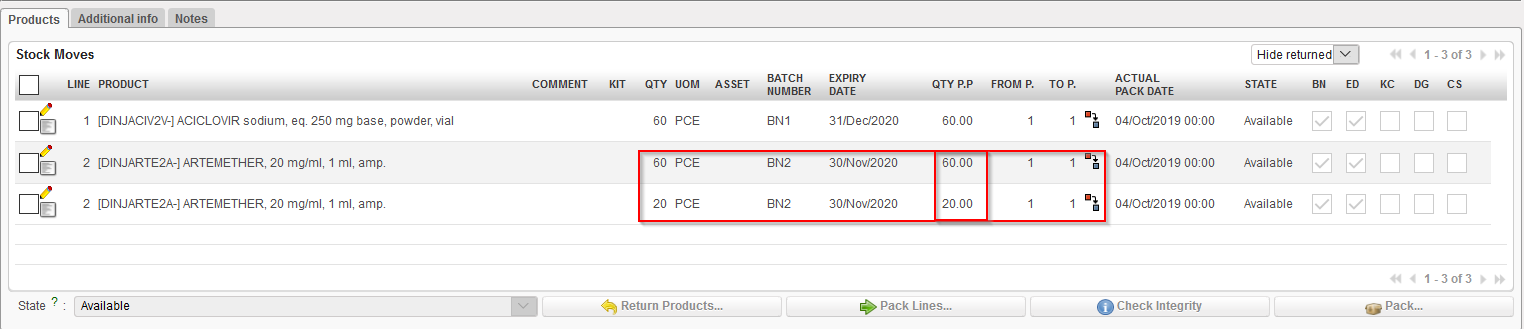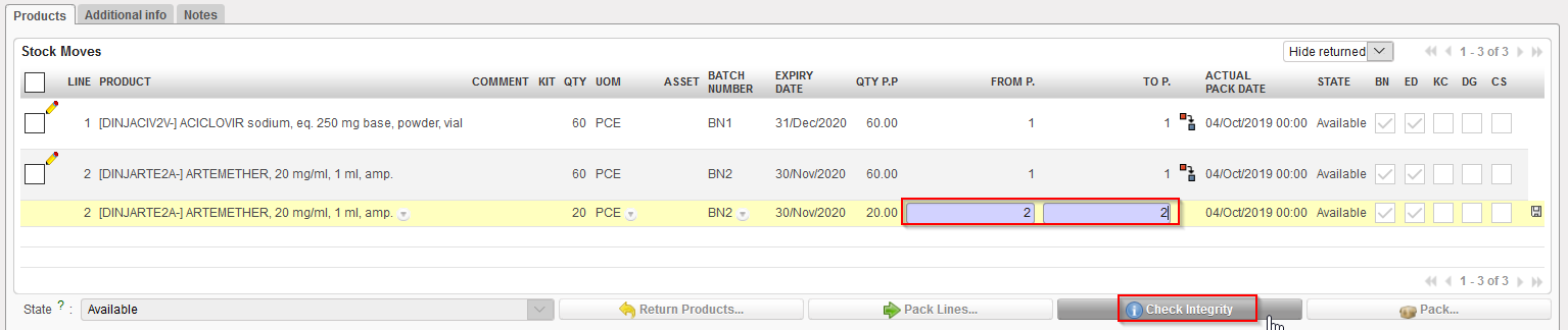 It is also possible to merge different products/batches in a same box (even if they are on lines in the PPL) by encoding them in the same box (“From P.” “To P.”). However, it can be tricky and you need to be very careful not to make the number of the boxes to overlap. Hence, the parcels numbers should be in sequential order from top product line to bottom product line. As already said, the “Check Integrity” button can help you with this.