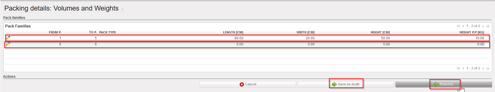 8. You reach the “Packing details: Volumes and Weights” where sizes and weight of the different parcels must be specified. Use the pencil icon to edit each line and specify length/width/height/weight for each parcel. Save each line after update using the floppy icon.