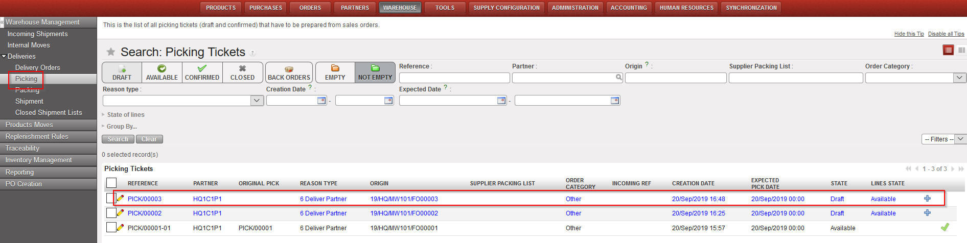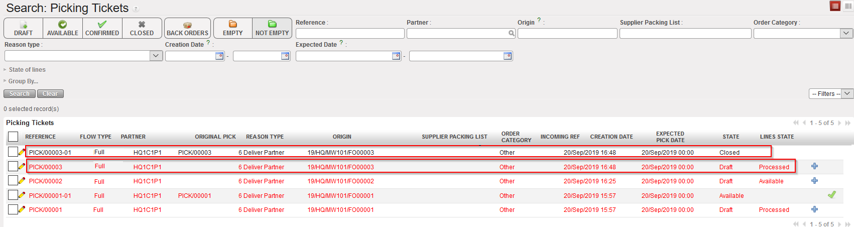 - Locate the relevant (main) Picking Ticket for the picking you are about to process. You may use the filters to help you. The “Origin” filter can be useful as it helps finding a Picking Ticket from the FO reference. The state of the (main) Picking Ticket should be “Draft“.