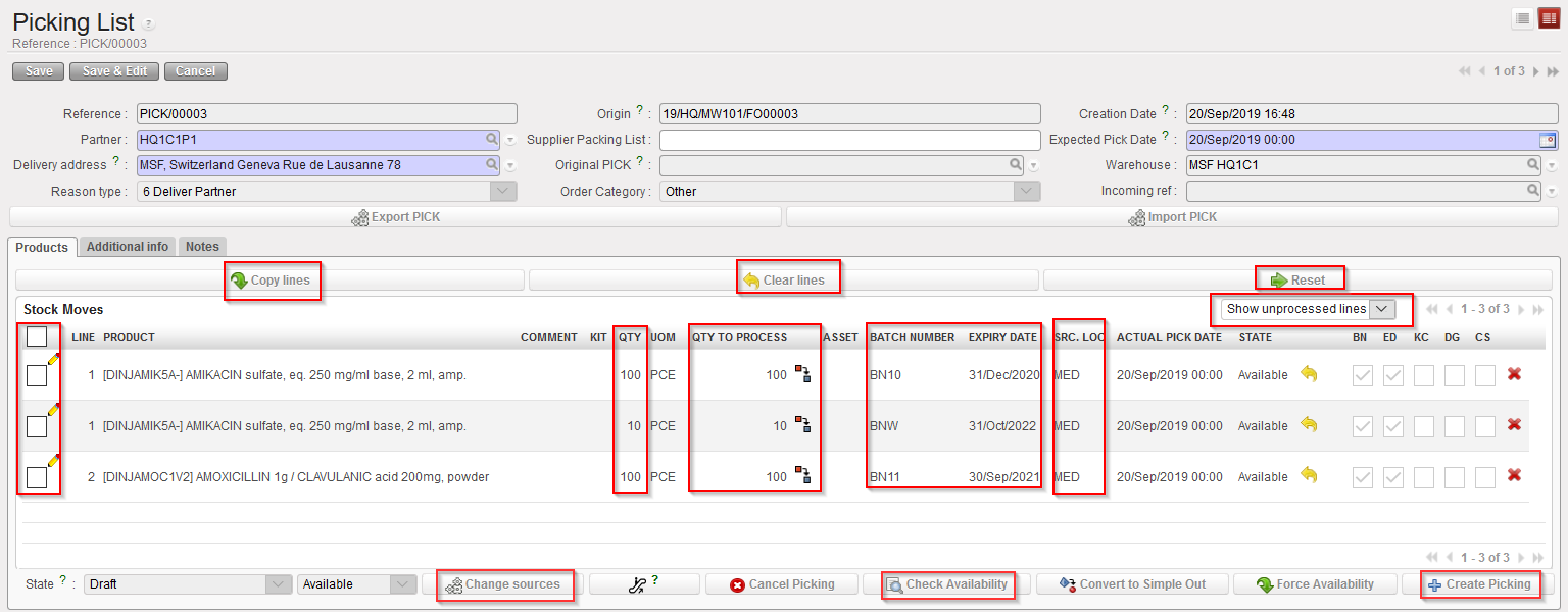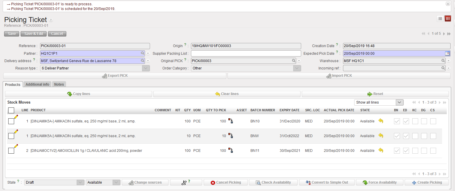 Please note: when checking availability, the system will automatically select the BN/ED using a FEFO logic (First Expired First Out) and will also split the lines accordingly depending on quantity available for each batch. If expired batches are available in the source location, and there are no other unexpired batches available, the system will display the line as “Not Available” (the user will have to select manually the expired product if necessary). This process also works for INT and OUT documents.