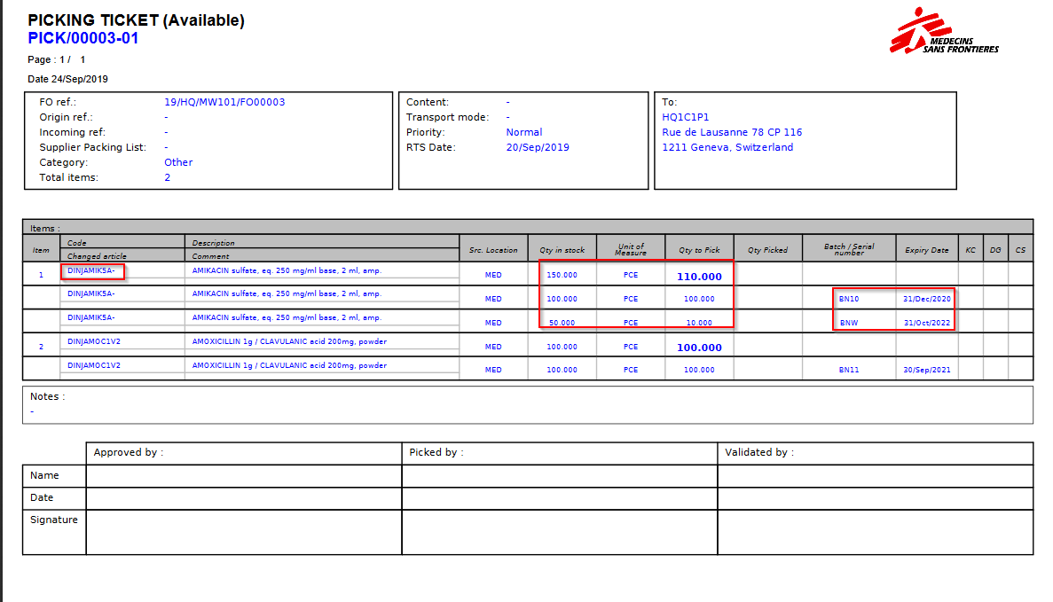 In the above example, we can see that DINJAMIK5A- is in stock (stock level = 150 pces in the MED location) and that the system advises us to pick 100 from the batch BN10 expiring on the 21/Dec/2020 for which we have a stock level of 100 pces in the MED location and 10 from BNW for which we have a Stock of 50 expiring in 31/Oct/2022. As a consequence, after picking the quantity of 110 pces from these batches we should remain with a total quantity of 40 pce of BNW (no more stock for BN10).