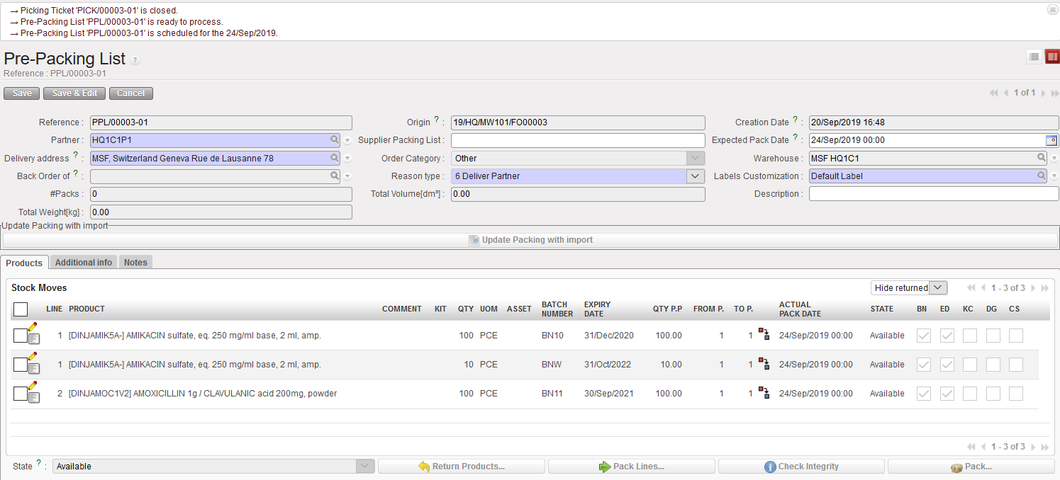 The system brings you to the “Pre-Packing List” screen which is the next step of the process (i.e. after picking the goods from the shelves, you should pack them in a box before to ship them to the customer).