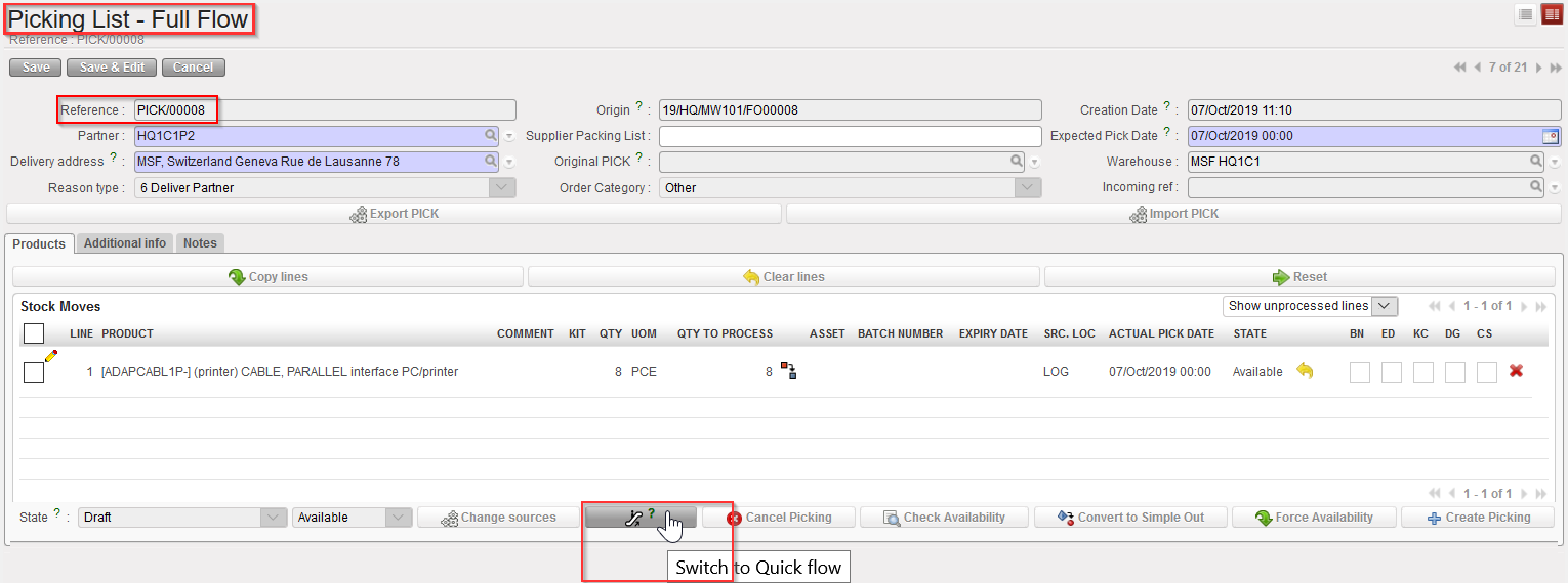 You will notice that this sub-PICK screen is the same as the PICK screen; the 3 main visible differences are the “QTY TO PICK” field (replacing the “QTY TO PROCESS”) ; the default filter is “Show all lines” (instead of “Show unprocessed lines”) and the absence of “Convert to simple Out” button which is only available for Main PICK.