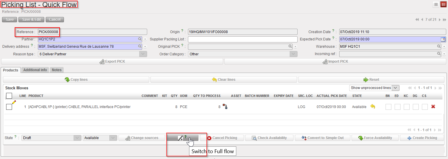 11. A sub PICK has been created by the system and is ready to be processed/validated. UniField opens the sub PICK created. Note that main PICKs have references which look like PICK/00003 while sub PICKs have references which look like PICK/00003-01.At this stage, you may wish to print the Picking Ticket via the “Picking Ticket” option available in the action menu. This printed document may be given to the storekeeper who will use it to pick the items in the warehouse and note on the printed document that has been actually picked (quantity, BN, ED,…).