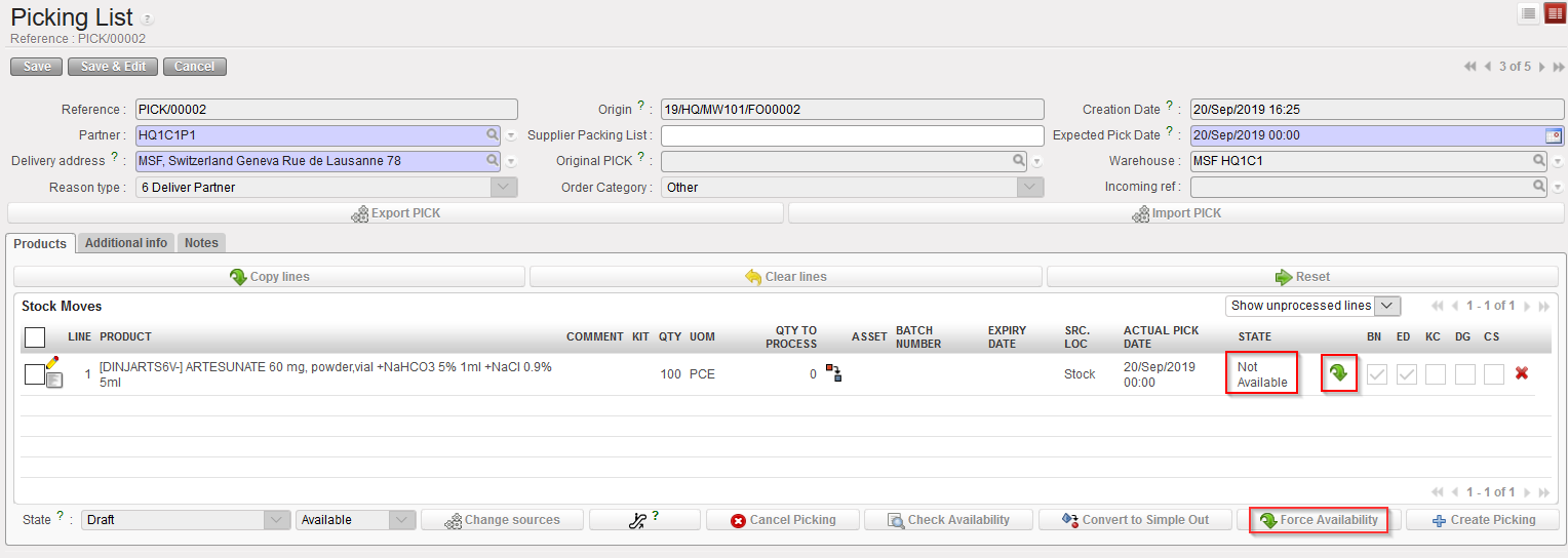 Forcing the availability on a Picking Ticket |