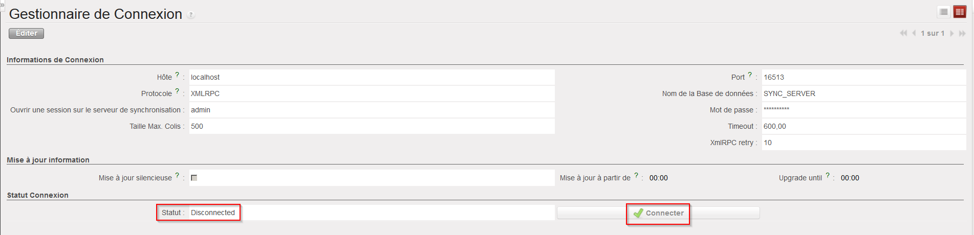- Cliquez sur la ligne pour l’ouvrir et vérifiez le “Statut” de la connexion. Si ce statut est “Disconnected”, cliquez sur le bouton “Connecter” pour connecter l’instance au serveur de synchronisation.
