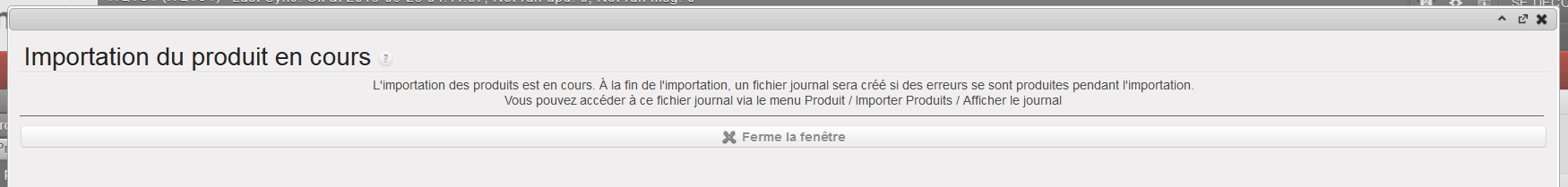 3. Cliquez sur le bouton “Ferme la fenêtre” et allez à Produits / Importer Produits / Afficher les fichiers journaux pour visualiser la progression de l’import et afficher un fichier de résultats une fois l’import terminé.