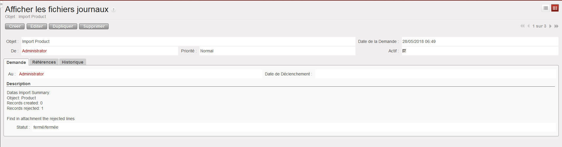 4. Recherchez le fichier de résultats lié à votre importation en utilisant les filtres. Une fois que vous l’avez repéré, cliquez dessus pour l’ouvrir. Les détails du résultat de l’importation sont affichés.