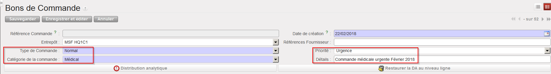2. Complétez l’entête du PO (Type de Commande, Catégorie de la commande, Priorité, Détails).