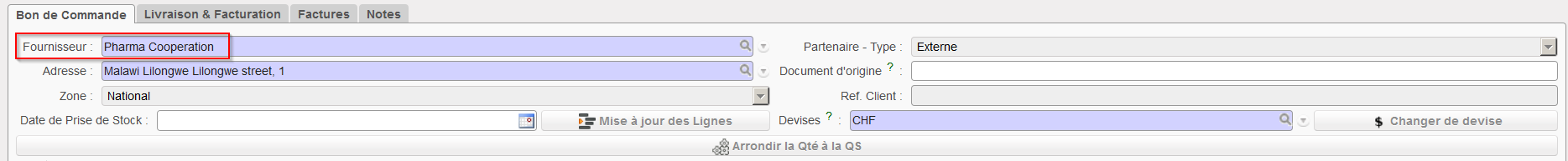 3. Introduisez un fournisseur sur l’onglet “Bon de Commande”. Vous pouvez le faire en entrant directement (une partie de) son nom dans le champ “Fournisseur” ou en utilisant l’icône représentant une loupe située à droite de ce champ. L’adresse, le type de partenaire, sa zone et la devise seront remplies automatiquement avec les informations provenant de la fiche fournisseur.