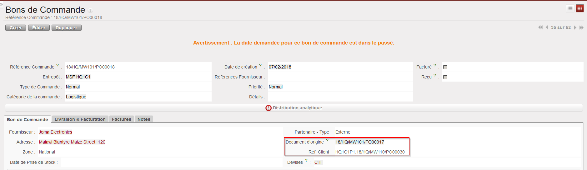 • Le champ “Document d’origine” indiquera la référence de la commande sourcée.